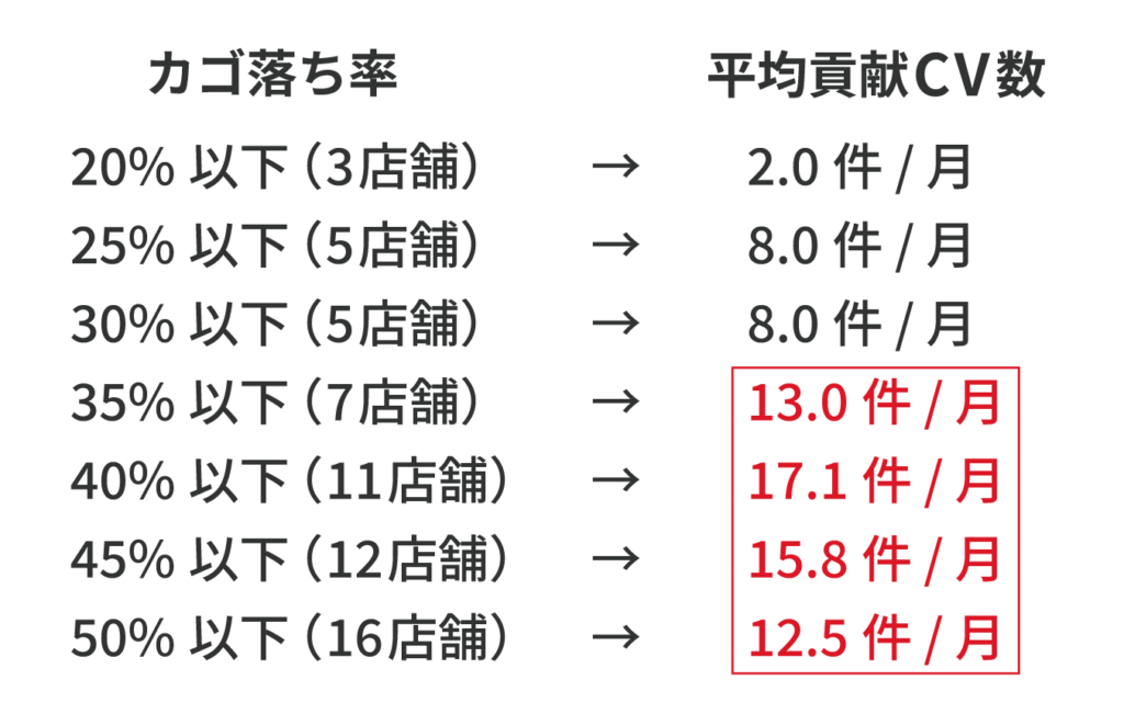 ・カゴ落ち率が35〜50% → カゴ落ち率が高いほど効果が出やすい