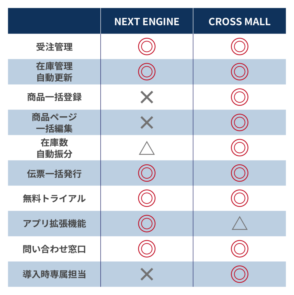 これらの業務を効率化する外部ツールとして多く問い合わせをいただくのが「NEXT ENGINE(ネクストエンジン)」と「CROSS MALL(クロスモール)」です。2つのツールどちらにするか、迷う店舗さんも多くいらっしゃいます。それぞれの特徴と、比較ポイントをご説明します。