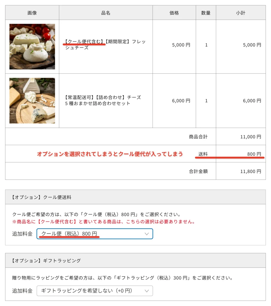 しかし通常設定のままだと期間限定商品を選択した場合でもクール便オプション選択画面が表示され、カスタマーがクール便を選択できてしまうため、二重でクール便を設定する事象が起きてしまいます。また、通常商品と期間限定商品をともに購入した場合でもクール便で同梱となるため、こちらもクール便の選択項目が表示されてしまうと、その後の処理・管理が大変になってしまいます。