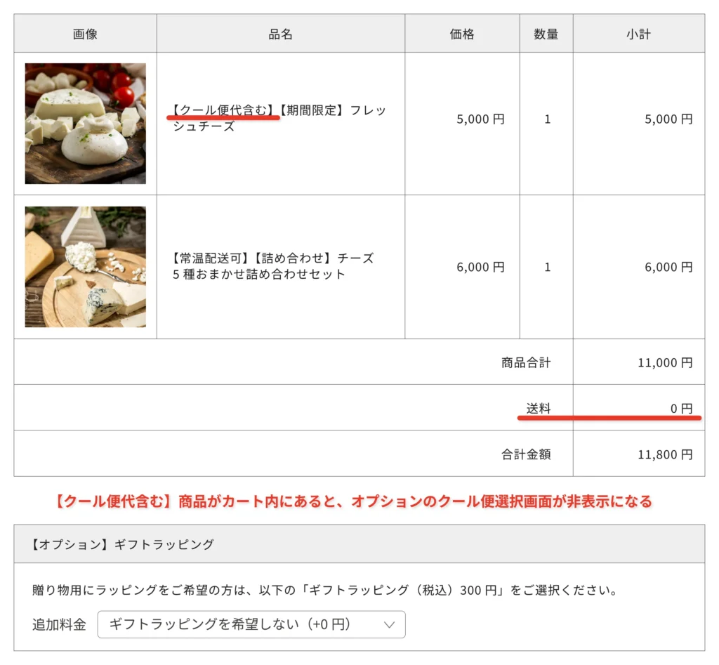 こちらは食品を取り扱う店舗さんで、カスタマーが希望する際はカート内で発送方法をクール便(有料オプション)に変更できる設定にしておりました。