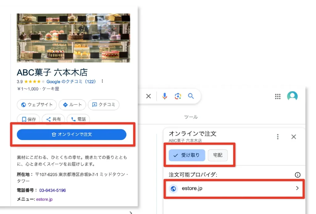 「オンラインで注文」をクリックすると、店舗受け取りか宅配かを選択でき、連携している注文プロバイダのページに遷移します。Googleビジネスプロフィールと連携することで、スムーズなオンライン注文が可能になります。