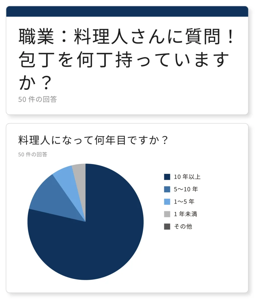 結果2週間で50件の回答があり、料理人歴10年以上・総包丁数10本以上持っている方が多い等、料理人さんのリアルな活用方法が見えました。