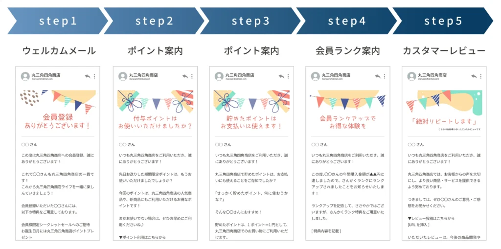 ステップメールのポイントを踏まえた上で、新規会員登録、かつメルマガ受信許可の方へ5つのステップメールを配信しました。