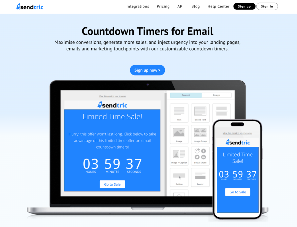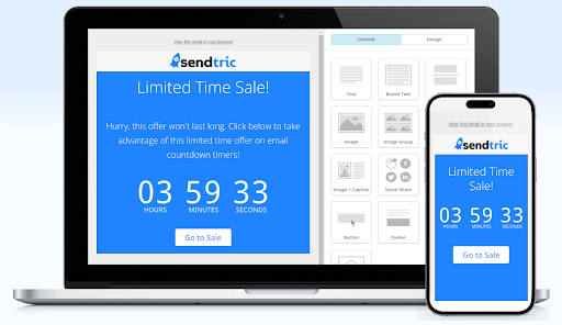 Sendtric は、ネットショップやメールマーケティングで活用できるリアルタイムのカウントダウンタイマーを簡単に作成できるツール です。特に、HTMLメールに埋め込めるカウントダウンタイマーを無料で提供しており、技術的な知識がなくても手軽に利用できます。