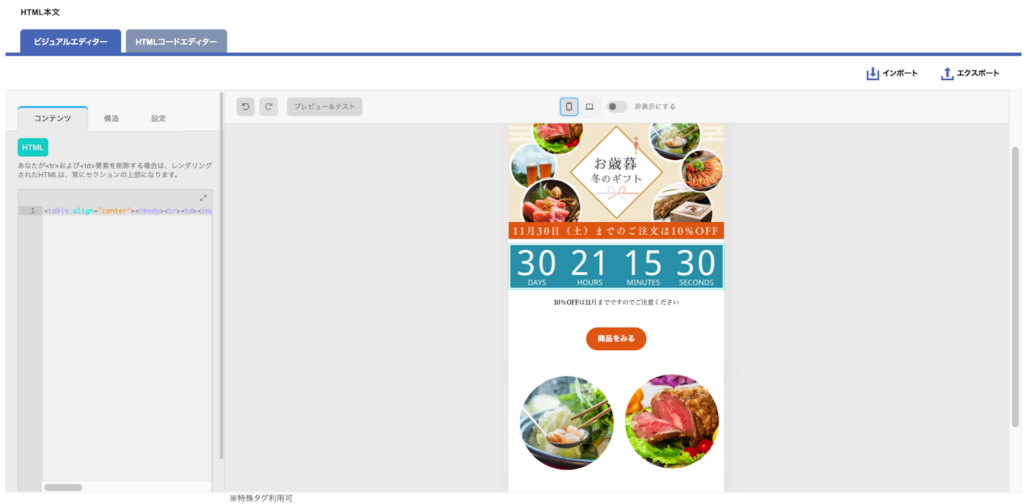 今回の施策では、2024年のお歳暮早割キャンペーンの最終リマインドメールにカウントダウンタイマーを活用しました。具体的には、メールの件名に「終了間際」という文言を加え、消費者に緊急性を感じさせると同時に、メール本文内にリアルタイムで動くカウントダウンタイマーを設置しました。