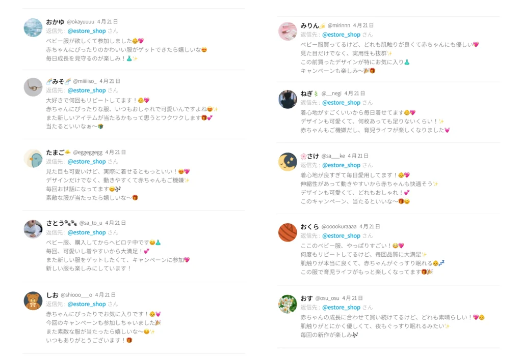 この店舗さんの商材はベビー服であり、購入するのが20〜40代の親とターゲット層がある程度定まっています。X(旧Twitter)は興味関心が同じ人々がつながるメディアのため、同じく赤ちゃんや年頃の近い子を持つ親同士で相互フォロワーであったりと、同じ環境や情報を集める人々がつながっており、ひとつのコミュニティができています。そのコミュニティ内に店舗さんのキャンペーンが目に留まれば、大きく拡散される可能性は高いと考えられます。