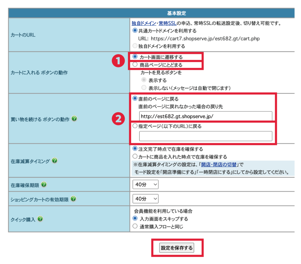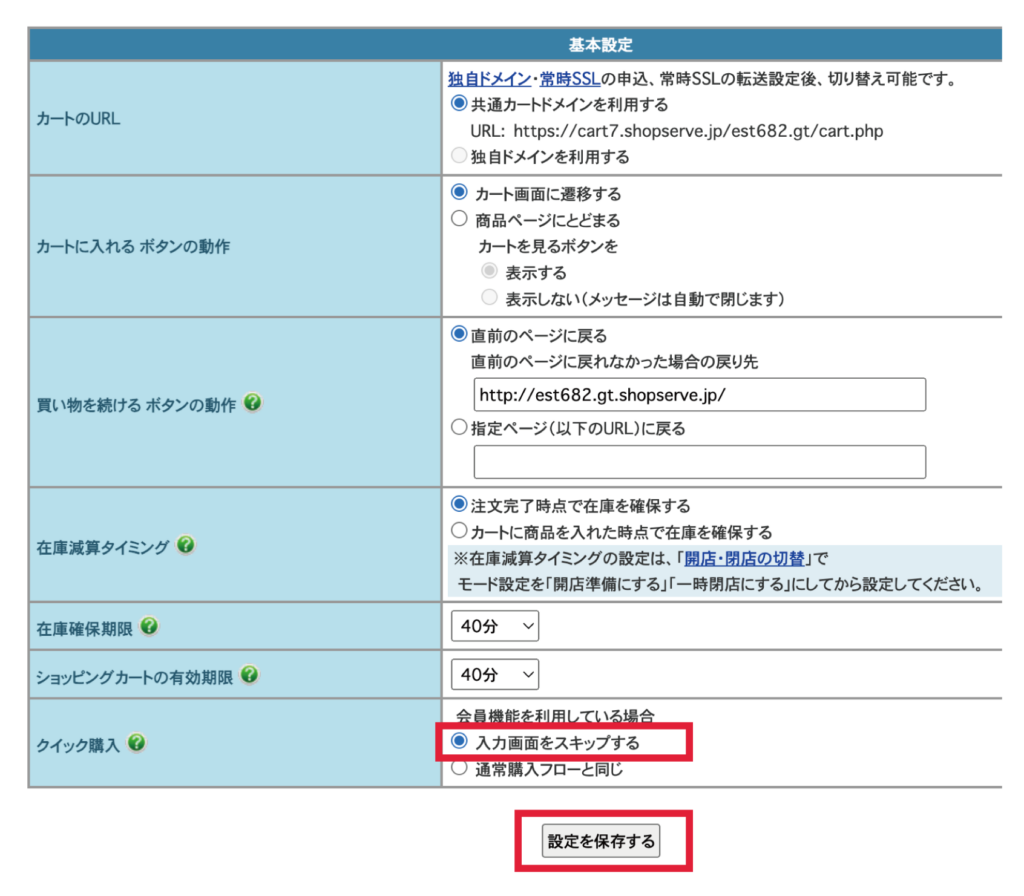 設定場所はクイック購入と同じく、お店設定 > ショッピングカート > 基本設定内にあります。こちらはデフォルトではONになっていないため、長期でつかっていただいている店舗さんはぜひご確認ください。
