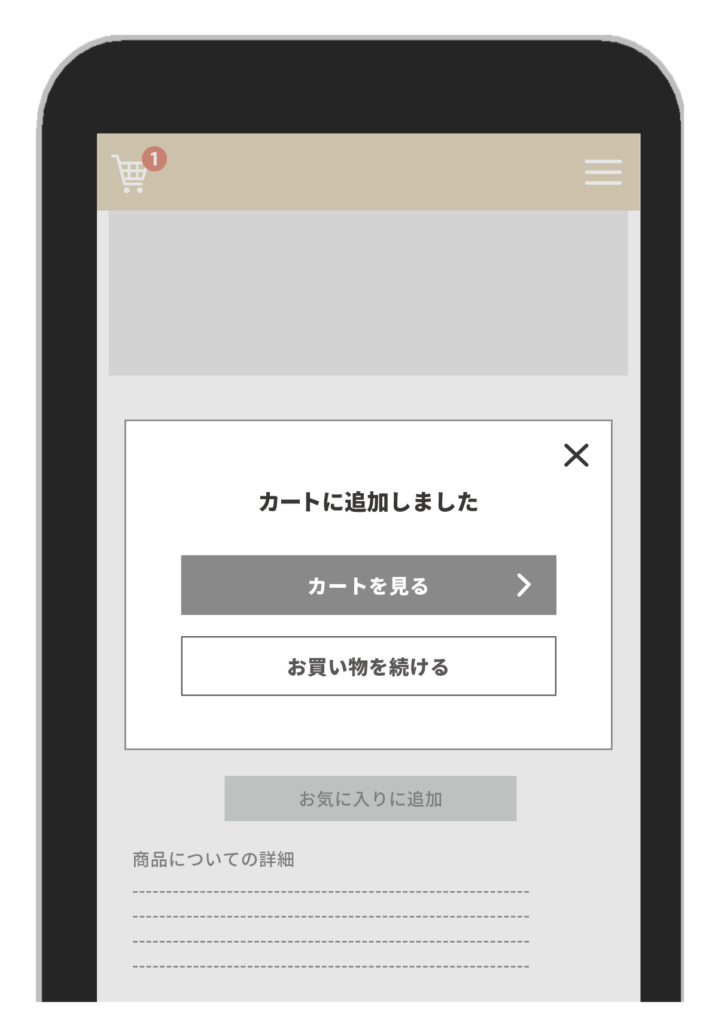 「カートを見る」で購入ページへ遷移、「お買い物を続ける」で直前に見ていた商品ページ、もしくは任意に設定したページへ遷移させることができます。買い物を続けたい方からすると、ページを戻ることによってカート内の商品が消えてしまうのでは?という不安や、前ページに戻る動作を面倒に感じるケースもあるため、上記のようなポップアップが出てくると便利です。