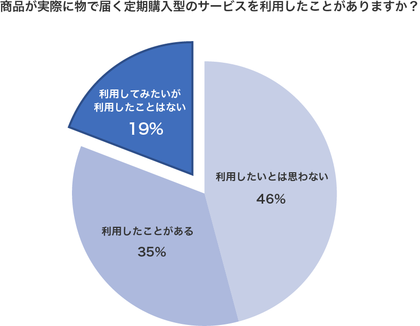 ECのミカタリサーチによる定期購入型サービス(サブスクリプション)に関する消費者意識調査では、「商品が実際に物で届く定期購入型のサービスを利用したことがありますか?(音声・動画データなどは該当しません)」という質問に対して「利用したいとは思わない」が46%、「利用したことがある」が35%、「利用してみたいが利用したことはない」が19%という回答結果が出ました。