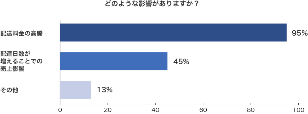 「皆さまのEC事業に影響がありますか?」という質問に対して、「影響がある」と回答した方は78%。そのうち、95%が送料の高騰を理由にあげています。配達日数が増えることによる売り上げへの影響を懸念している方は45%という回答結果でした。