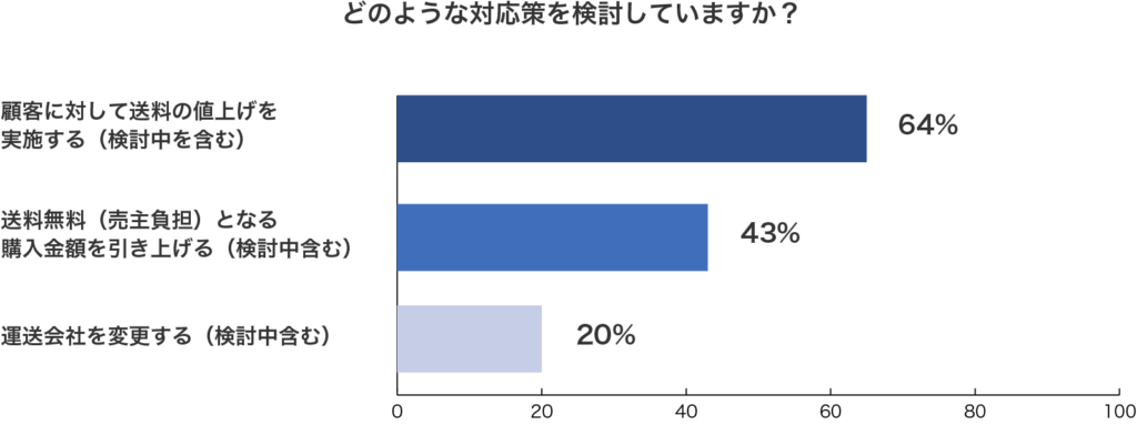 2024年問題の対応策として、送料の値上げをする(検討中含む)と回答した方は64%、送料無料(売主負担)となる購入金額の引き上げ(検討中含む)と回答した方は43%、運送会社を変更する(検討中を含む)と回答した方は20%でした。