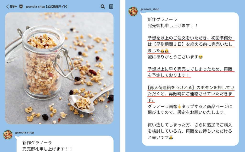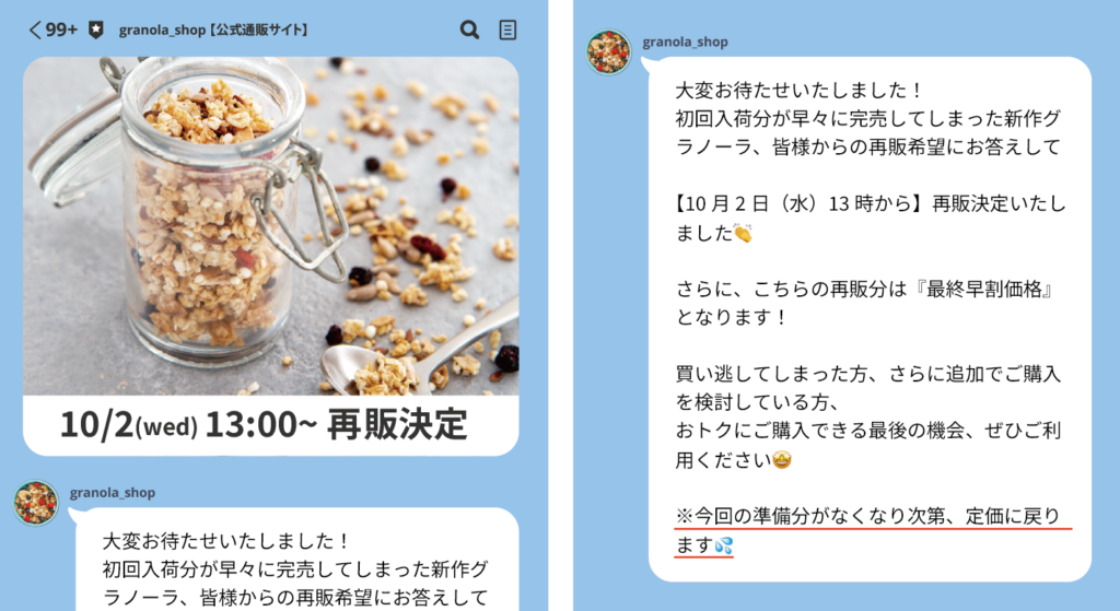こちらは販売期間終了後のLINE告知です。早割期間を3日間と短く設定し、早期完売を演出しています。これにより、人気商品という印象を与え、さらに購入意欲を高める事ができます。また、再販を予定していることをお知らせして再入荷通知の登録を促し、次回の販促に繋げています。再入荷通知の登録は次回販売に必要な販売数のひとつの目安となりますし、早割販売は早いタイミングで商品を手にしてもらうことで口コミも集まり、再入荷や商品への期待を高める効果もあります。