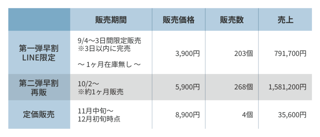 3日間の早割後は、販売期間を設けずに早割単価を上げて再販を行いました。先行早割3,900円、再販早割5,900円と先行早割に比べて2千円上乗せしています。再販時はLINE登録者限定にはせず、販売期間も設けず、「再販準備分がなくなり次第定価に戻す」と案内することにより販売数と期間を自由にコントロールできるようにしました。