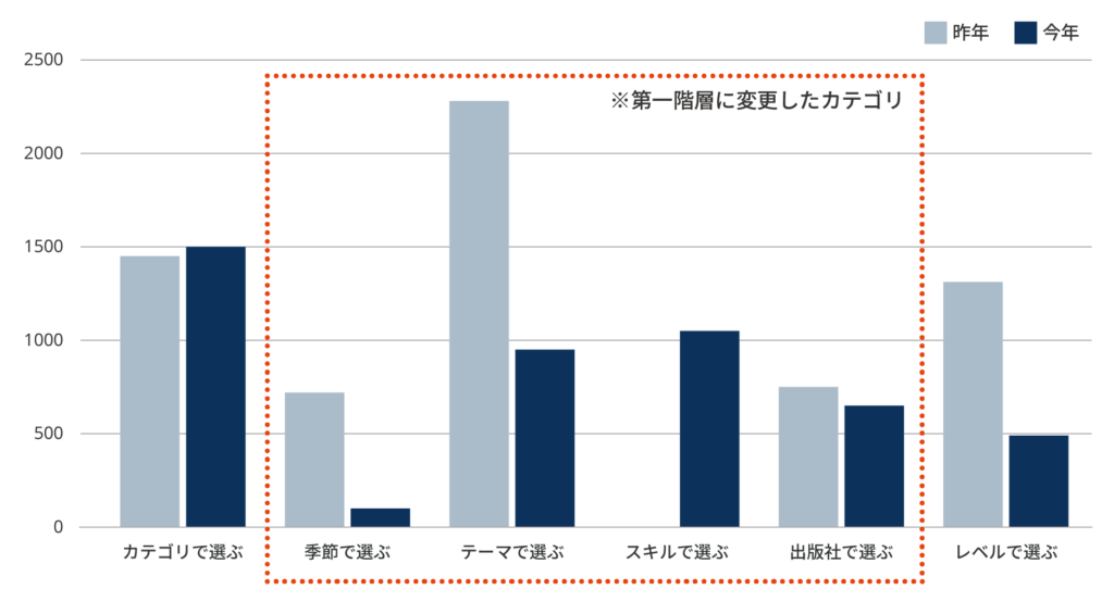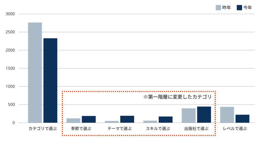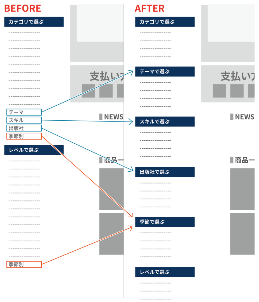 左がカテゴリ変更前、右がカテゴリ変更後です。「カテゴリ別」の下階層にあった「テーマ別」「スキル別」「出版社別」を上の階層に移動させて、「カテゴリ別」と「レベル別」の2項目内にあった「季節別」も上の階層に移動させました。