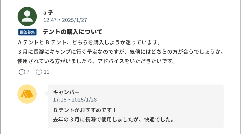 アウトドア用品を扱うネットショップに「ユーザーコミュニティ」コーナーを設置し、商品に関する専門的な質問やマニアックな使い方をユーザー同士で回答し合えるようにします。「このテントは風速何メートルまで耐えられますか?」といった企業側では答えにくい質問に対し、経験豊富なユーザーが「先日のキャンプで約15m/sの風でも大丈夫でしたよ」と実体験をもとに回答する。このようなやり取りが活発であれば、サイトの訪問者は安心して質問でき、サイトに対する信頼感も高まります。