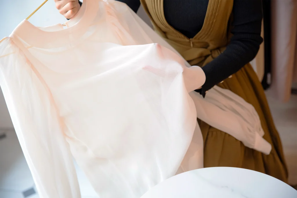 金様:そうですね。授乳服の制作では、普通のシースルーブラウスをマタニティ服にする際、単にサイズを大きくするだけでなく、「インナーがついてないと困る」「授乳期のブラは肩紐の厚みがあるから、キャミソールだと紐が見えてしまう」といった細かな点まで考慮しました。